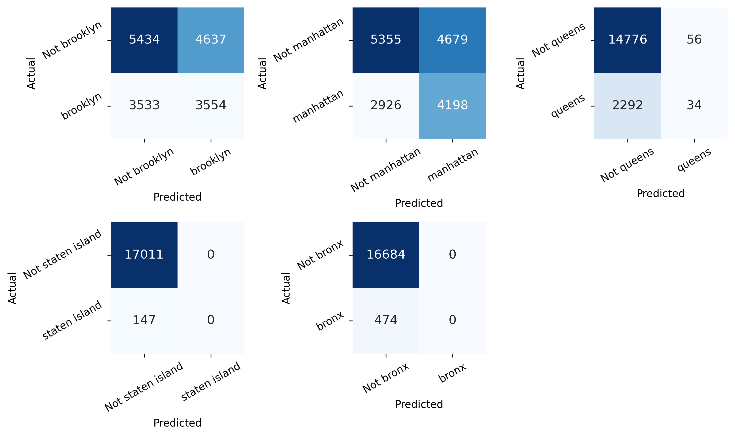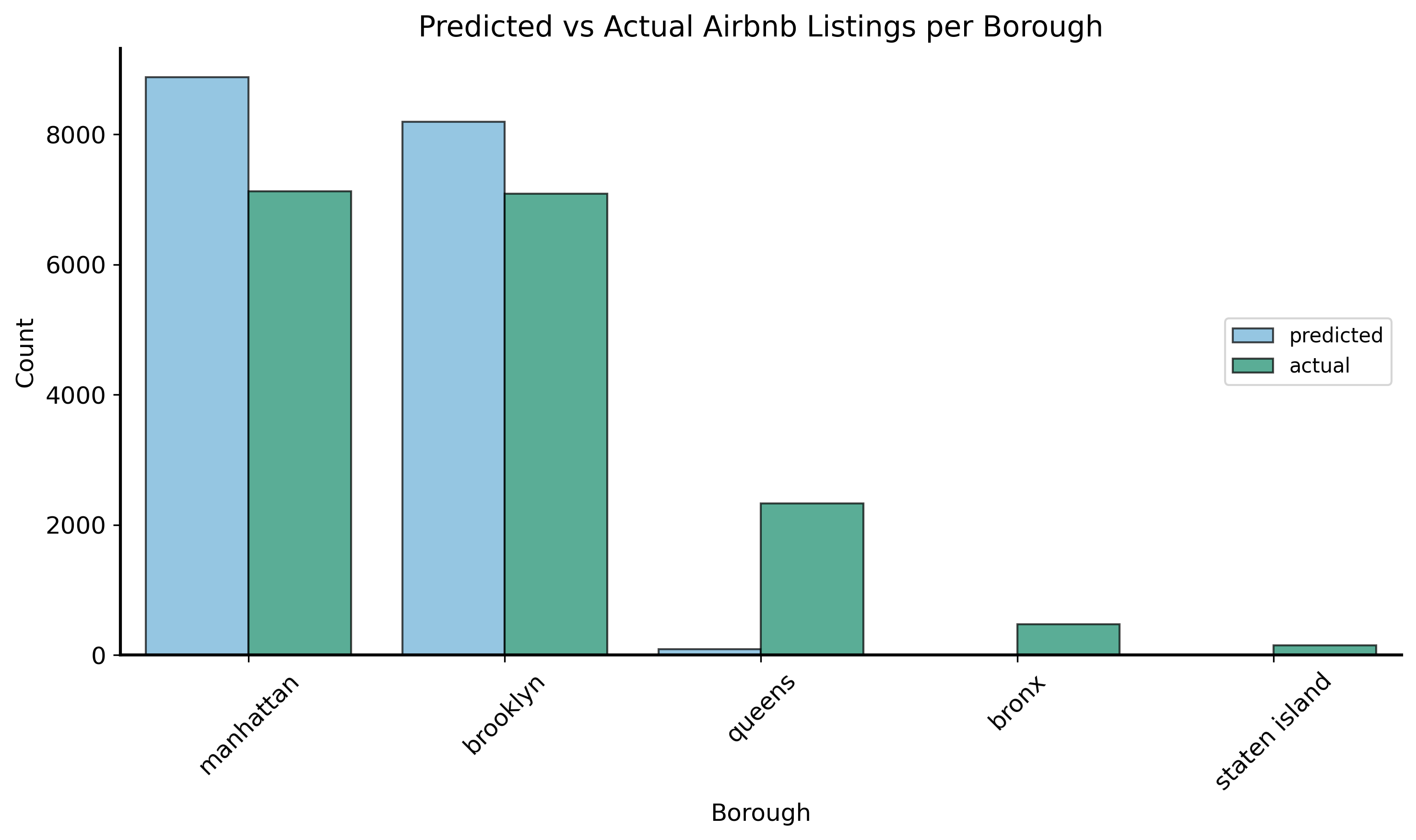 It looks like the model is a bit crude (it predicts no listings in the Bronx or Staten Island), but it does at least capture the general trend that listings are more likely to be in Manhattan and Brooklyn than in the other boroughs.