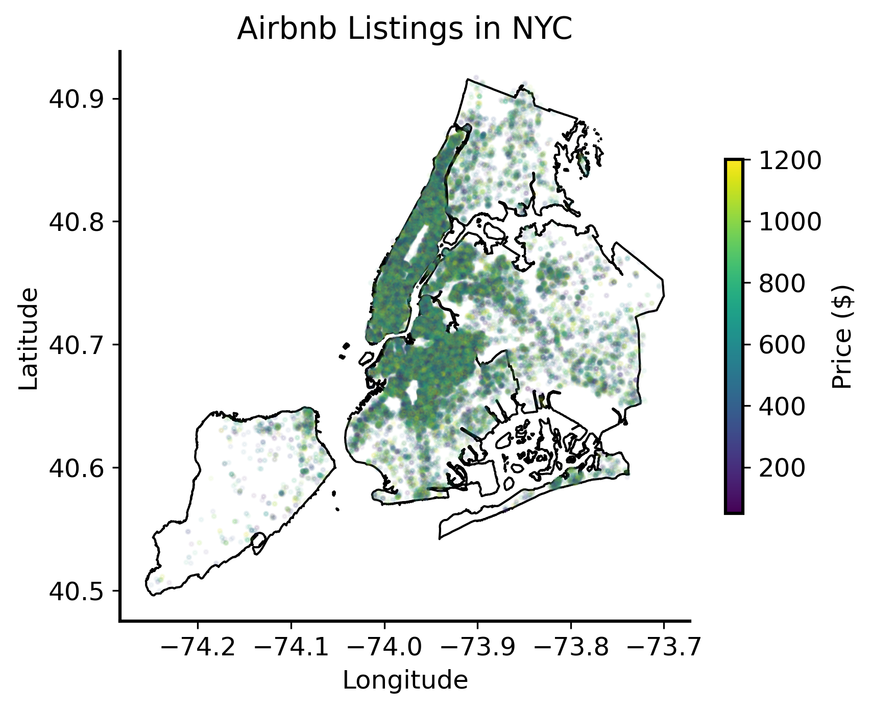 We can even use specialized libraries to make use of the geographic information in the data. For example, we can use the geopandas library to plot the locations of listings on a map of New York City.