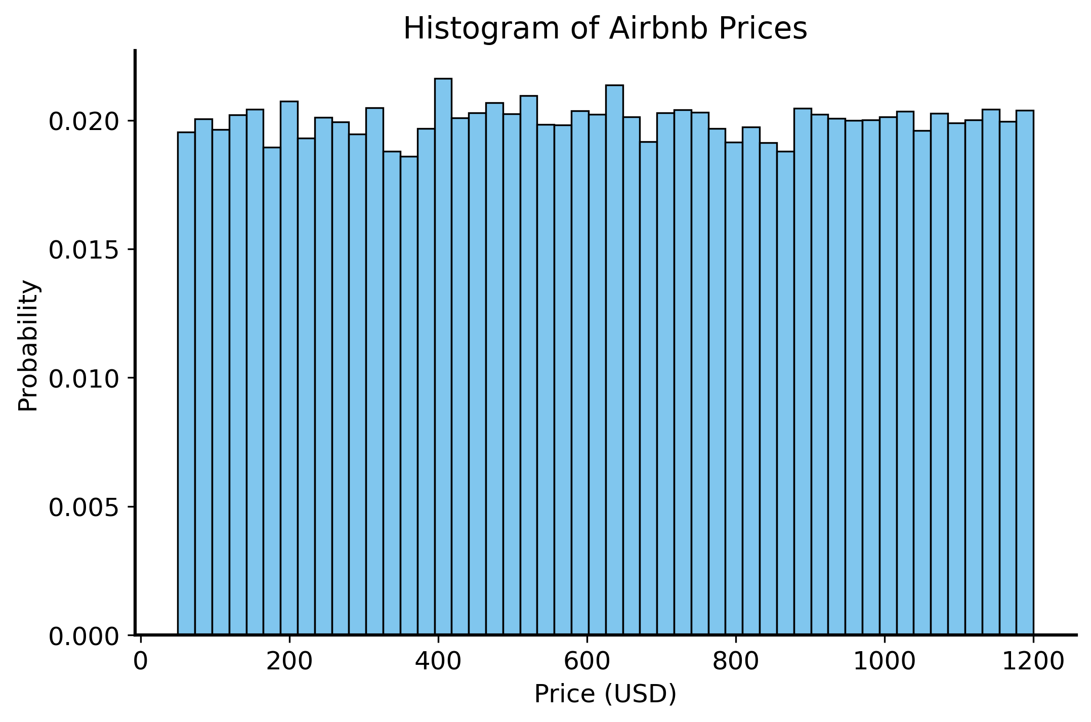 The prices of Airbnb listings from back in the first lecture are a good example of a continuous random variable. The resolution (cents) is so small that basically every price is unique. So we cannot just count the number of occurrences of each price. Instead, we can create a histogram to visualize the distribution of prices across bins.