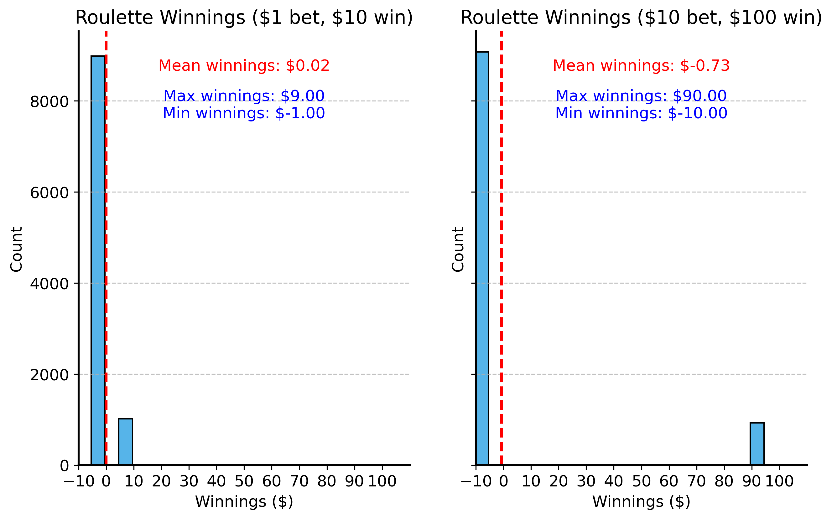 The amount that the winnings vary, though is exactly the same as the original roulette game. How can we replicate this notion mathematically?