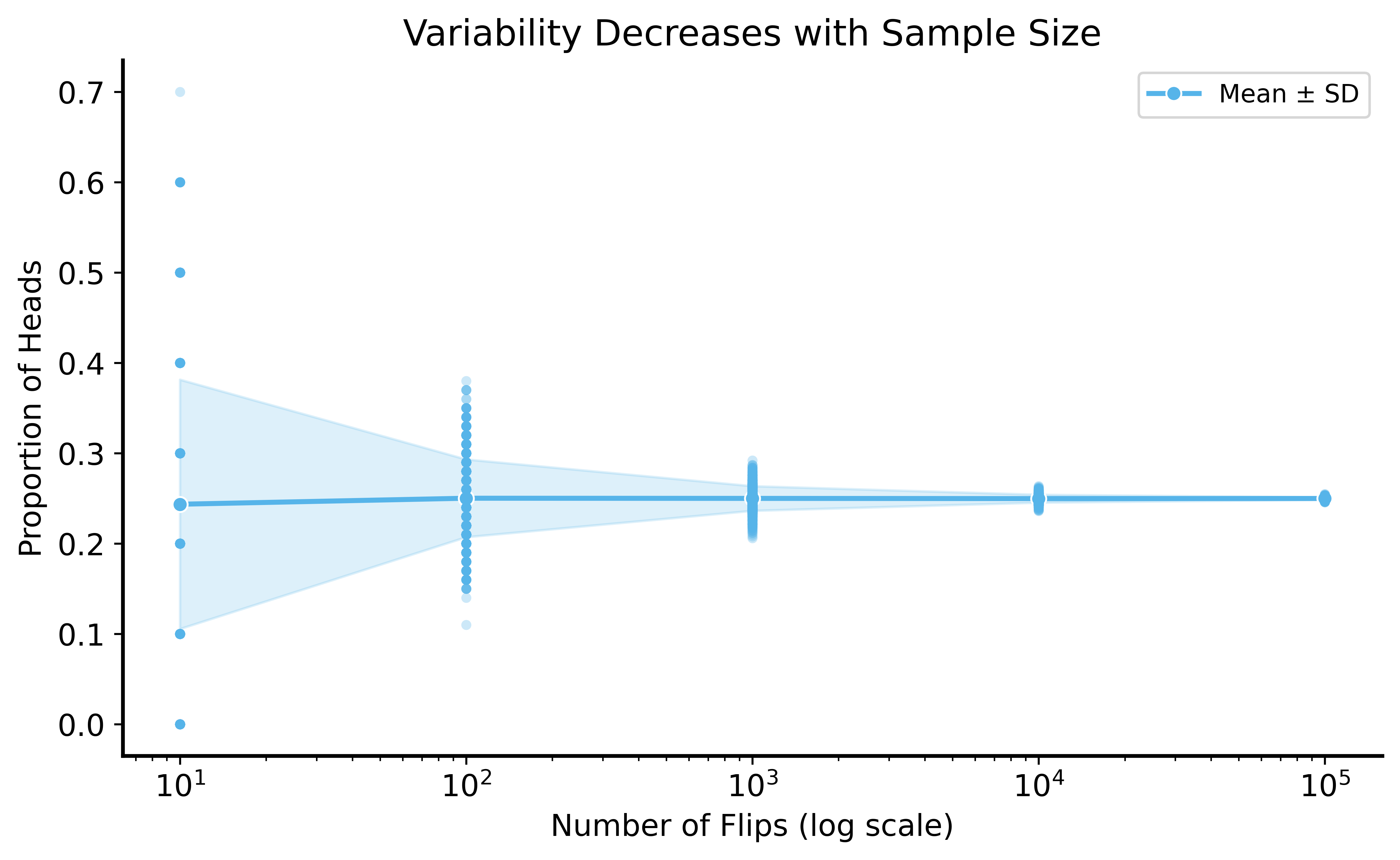 Notice: even with high variability in small samples, the sample mean is centered around the true mean.