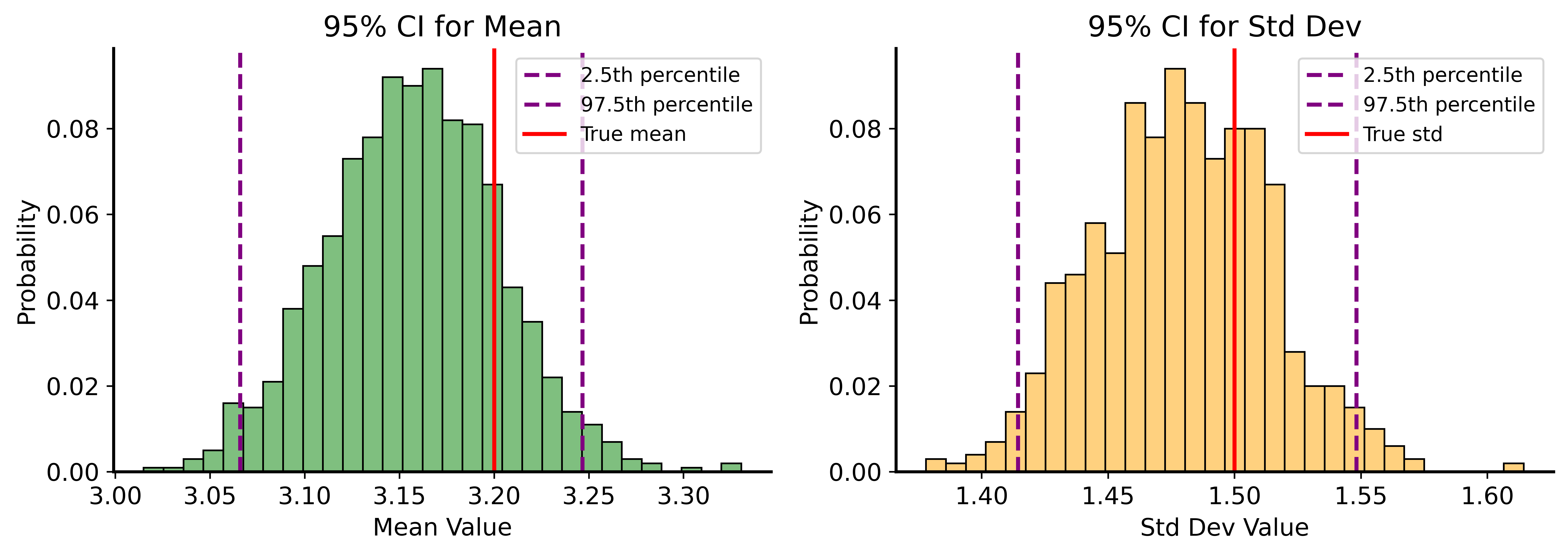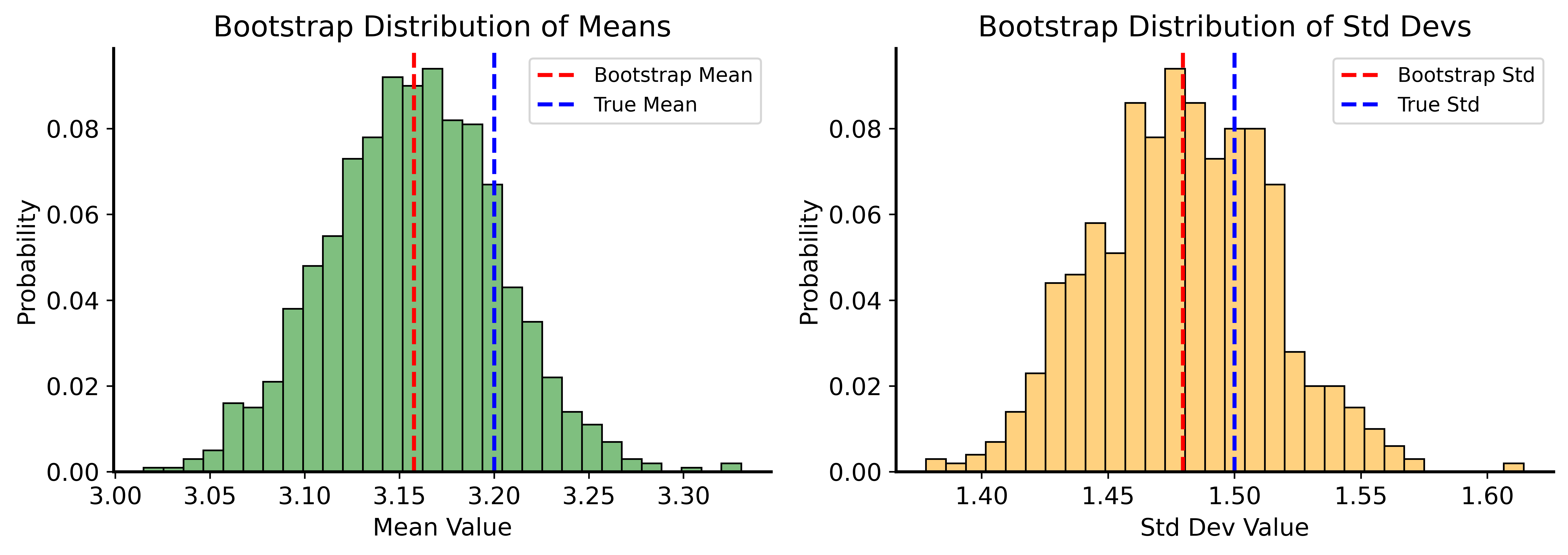 print(f"True std: 1.5, Bootstrap std: {np.mean(bootstrapped_std):.2f}")True mean: 3.2, Bootstrap mean: 3.16