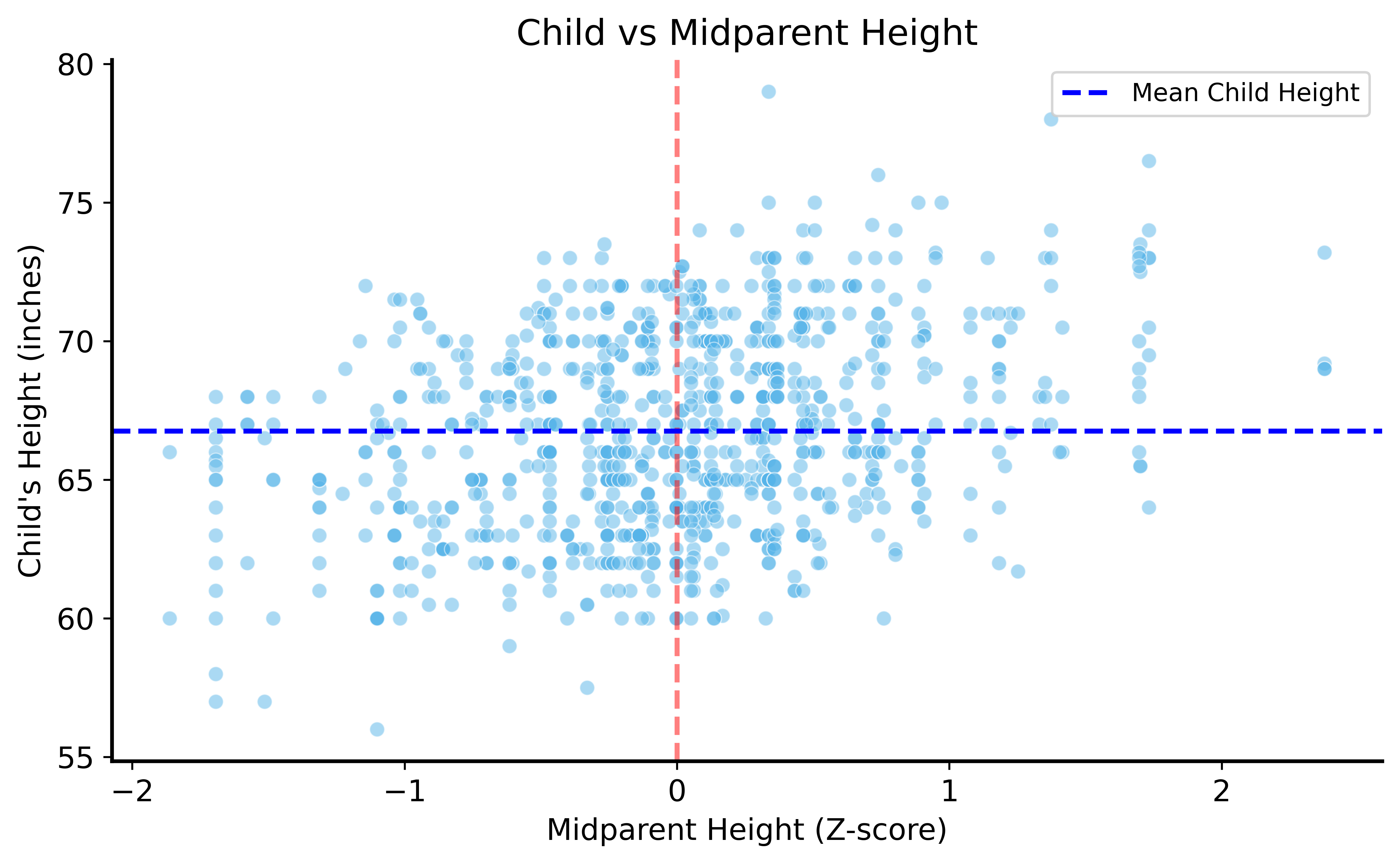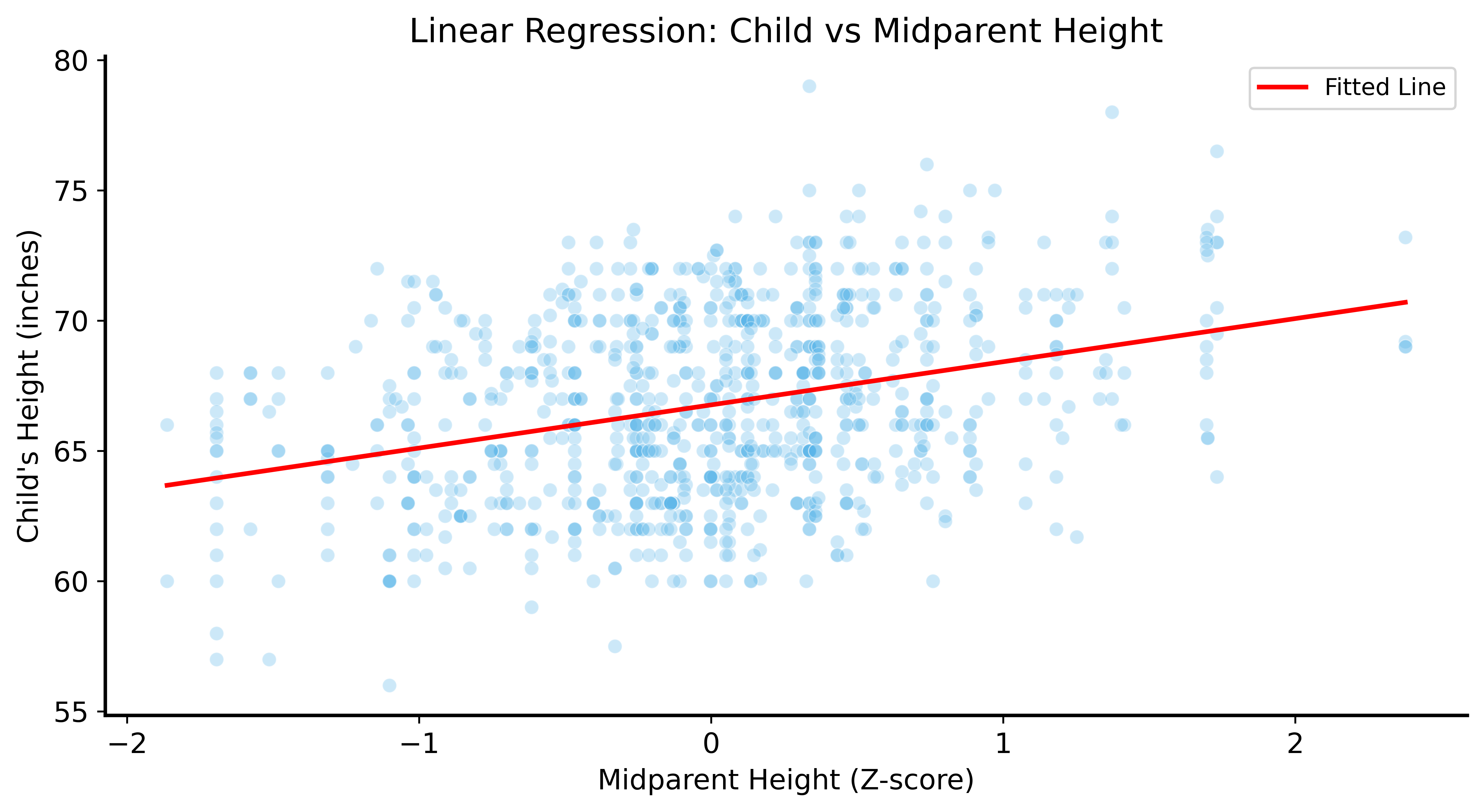 Interpretation: For every 1 standard deviation increase in midparent height, predicted child height increases by 1.7 inches.