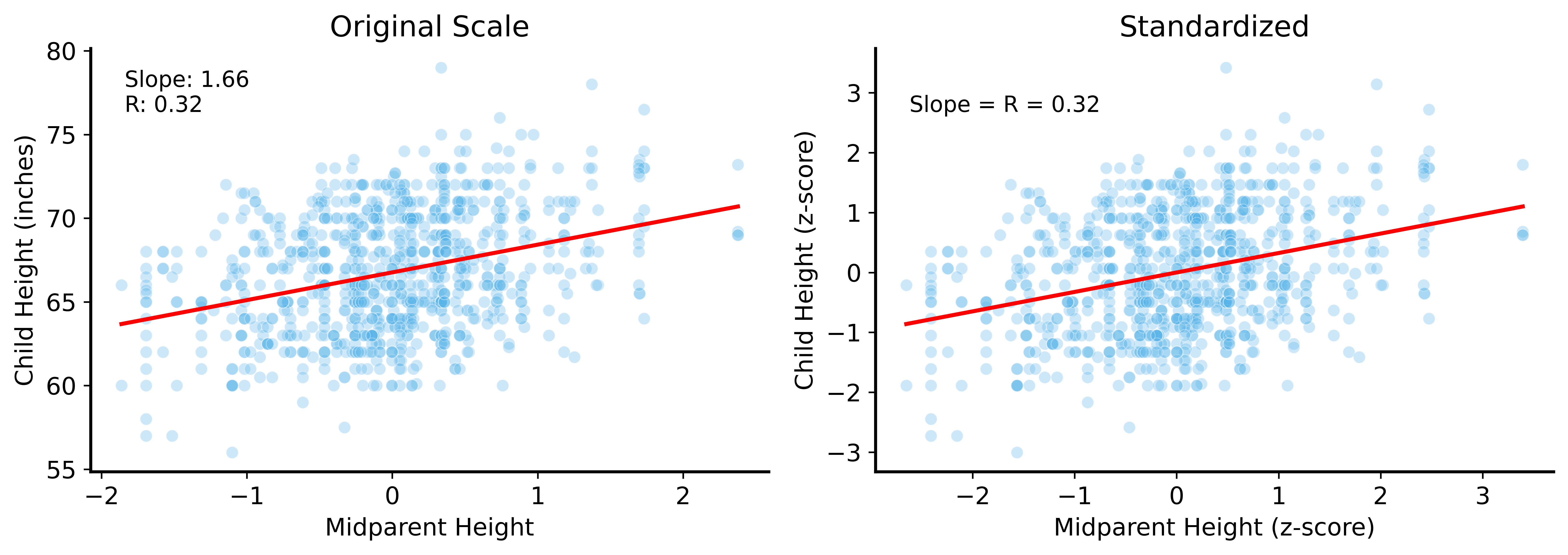 Key insight: When both variables are standardized, the slope equals the correlation!