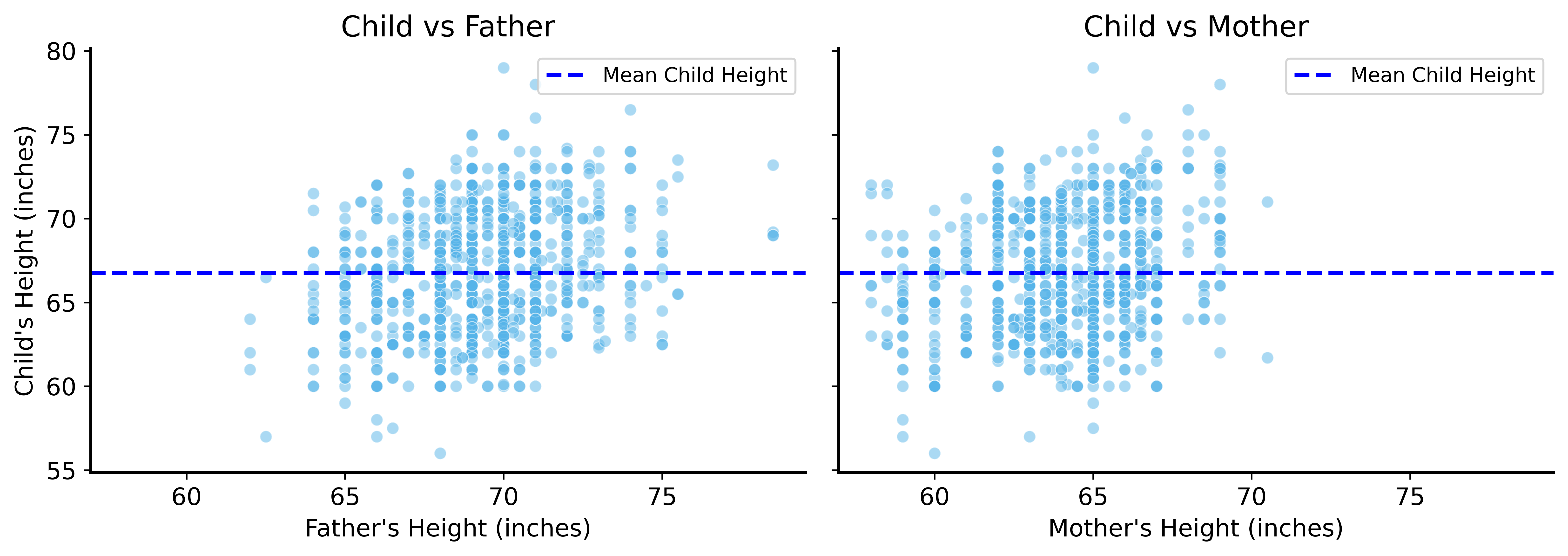 \[\text{predicted height} = \text{slope} \times \text{midparent} + \text{intercept}\]